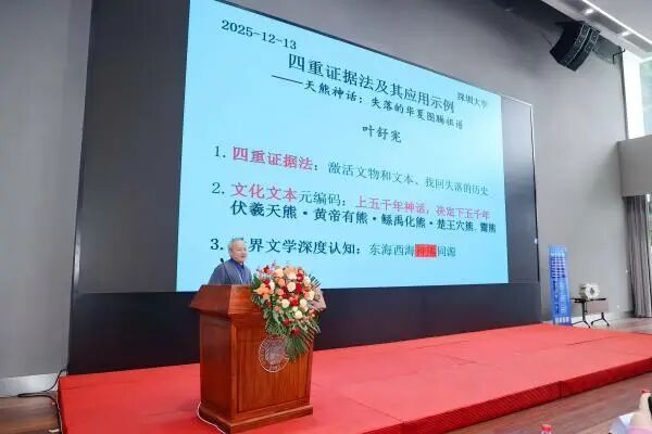 本次中國學(xué)術(shù)評(píng)價(jià)論壇主題為“中國哲學(xué)社會(huì)科學(xué)原創(chuàng)研究方法與自主知識(shí)體系建構(gòu)”,由中國人民大學(xué)書報(bào)資料中心、中國哲學(xué)社會(huì)科學(xué)自主知識(shí)體系數(shù)字創(chuàng)新平臺(tái)(學(xué)術(shù)世界)等多家單位主辦,葉舒憲教授作“四重證據(jù)法及其應(yīng)用示例”的主旨報(bào)告。這是對(duì)葉教授繼2024年獲頒“中國比較文學(xué)終身成就紀(jì)念證書”后的再次肯定,表彰其近四十年來持續(xù)在跨學(xué)科方法論創(chuàng)新及文明探源研究領(lǐng)域做出的卓越貢獻(xiàn)。