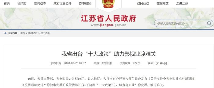 2月19日,江蘇省八部門聯(lián)合發(fā)布《關(guān)于支持全省電影業(yè)應對新冠肺炎疫情影響促進平穩(wěn)健康發(fā)展的政策措施》,即“影十條”,從落實稅收優(yōu)惠政策、加強財政支持力度、加大信貸投放、減免房租等十方面幫助電影業(yè)。