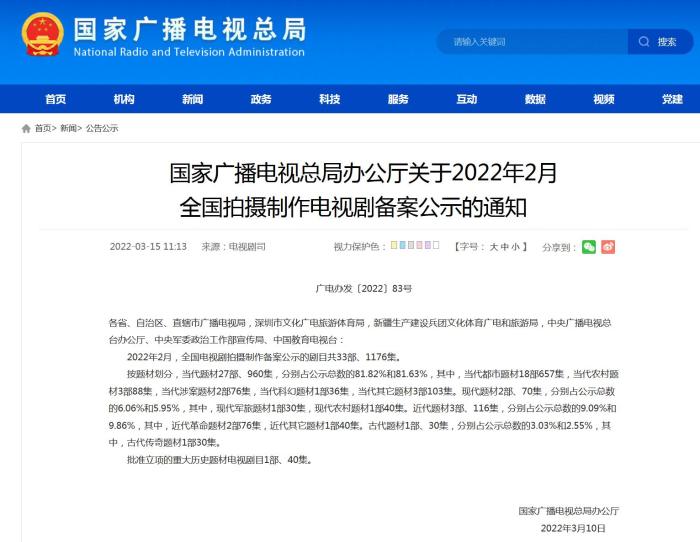 3月15日,國家廣播電視總局網(wǎng)站刊發(fā)關(guān)于2022年2月全國拍攝制作電視劇備案公示的通知(以下簡稱通知)。其中顯示,2022年2月,全國電視劇拍攝制作備案公示的劇目共33部、1176集。