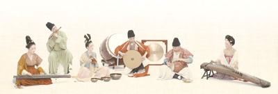 淡黃色的背景如宣紙鋪陳,樂(lè)師們身著朱紅圓領(lǐng)袍、艾綠上衣、藕色絹衫等,或撫古琴,或吹笛簫,或擊大鼓……演奏的是中國(guó)傳統(tǒng)樂(lè)器,流淌的樂(lè)音卻是電影《哈利·波特》主題曲、巴赫《G弦上的詠嘆調(diào)》……