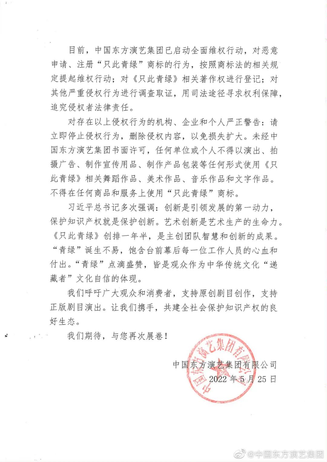作為舞蹈詩劇《只此青綠》出品方之一,中國東方演藝集團25日發(fā)表聲明,已啟動對《只此青綠》的全面維權(quán)行動。