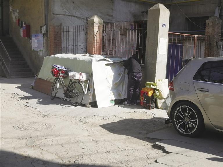 隨后,記者來(lái)到閔家橋59號(hào),破舊的小區(qū)內(nèi)堆積的雜物很多,有人堆積紙箱,有人干脆在小區(qū)院子內(nèi)“圈地”堆放私人物品。“不知道人家在堆放什么,可是進(jìn)門(mén)就能看見(jiàn),很不雅觀(guān)。”居民李先生說(shuō),小區(qū)是老舊樓院,長(zhǎng)期沒(méi)人管理,衛(wèi)生環(huán)境雖然不差,但是小區(qū)內(nèi)堆積的東西太多。小區(qū)里有一個(gè)收廢品的,每天將回收來(lái)的紙箱堆積在單元樓門(mén)口,另一戶(hù)人家干脆“圈地”將自家的私人物品堆放在這里,用塑料布遮蓋起來(lái),很不美觀(guān)。