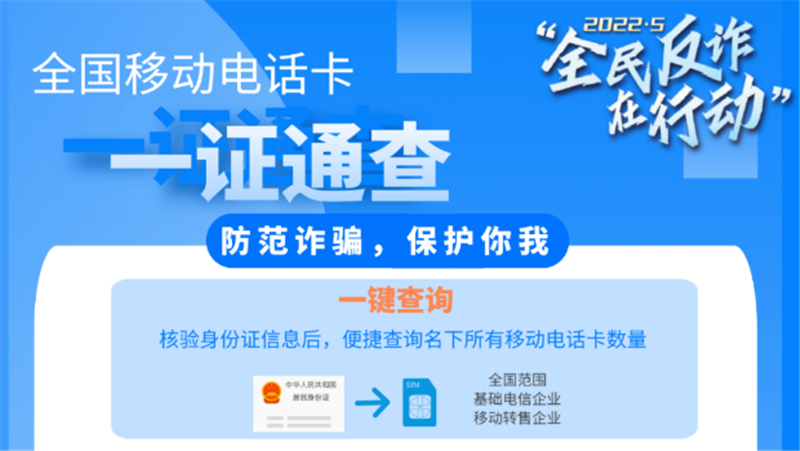 詐騙分子冒用他人身份開辦電話卡嚴重侵害用戶本人合法權益,廣大群眾對此深惡痛絕。“一證通查”服務打通了93家省級基礎電信企業(yè)和39家移動通信轉售企業(yè)相關數(shù)據(jù),群眾只需要使用自己的居民身份證,即可通過線上線下多種渠道查詢本人名下持有的全國移動電話卡數(shù)量,專用短信端口10699000將在48小時內向預留手機號反饋結果,真正實現(xiàn)了全國移動電話卡的統(tǒng)一便捷查詢。
