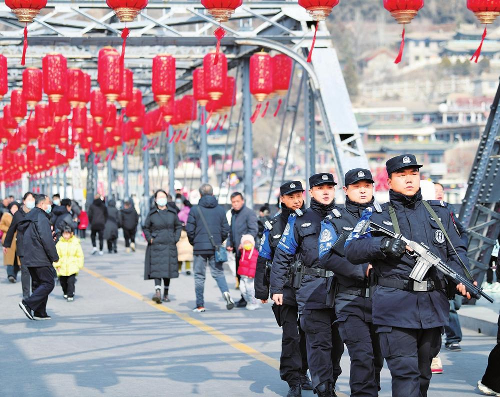 春節(jié)期間,蘭州市公安局城關(guān)分局中山橋警務(wù)站民警在中山橋巡邏,確保社會(huì)治安大局平穩(wěn)有序。新甘肅·甘肅法治報(bào)記者王輝攝