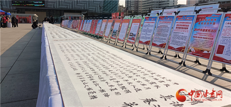 活動(dòng)現(xiàn)場(chǎng),省委宣傳部、省委政法委、省法院、省檢察院等20余家單位結(jié)合行業(yè)實(shí)際,宣傳憲法,普及法律知識(shí),為群眾提供法律咨詢。為了豐富普法載體,讓群眾在互動(dòng)參與中學(xué)習(xí)法律知識(shí),活動(dòng)展出了由定西市通渭縣司法局聯(lián)合書法家、師生群體、法官、檢察官、公安民警等各行各業(yè)工作人員創(chuàng)作的百米《書·法》長(zhǎng)卷,鐫刻法治精神,書寫法律法規(guī)?,F(xiàn)場(chǎng)還表演了精彩的文藝節(jié)目。