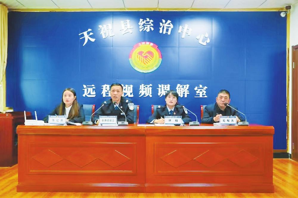 天??h綜治中心組織金牌調解員、律師等在遠程視頻調解室為群眾調解矛盾(資料圖)。