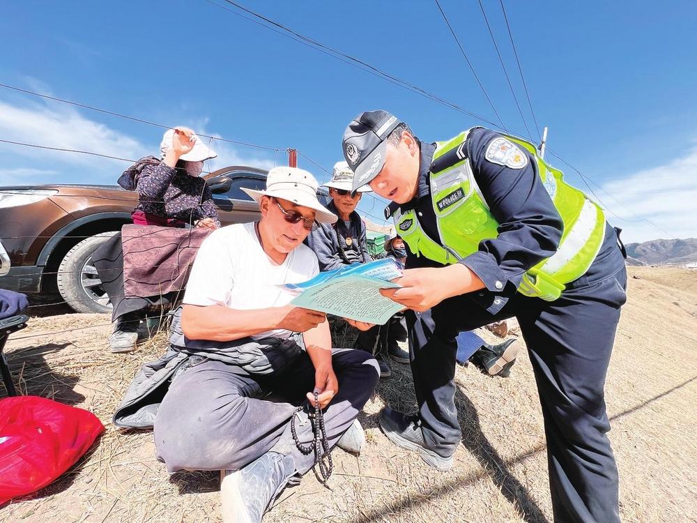 民輔警向群眾講解交通安全知識(shí)。近日,碌曲縣公安局交警大隊(duì)民輔警借助夏澤灘春季賽馬活動(dòng)有利時(shí)機(jī),開(kāi)展“美麗鄉(xiāng)村行”交通安全巡回宣傳活動(dòng)。 新甘肅·甘肅法治報(bào)記者金凡裕攝