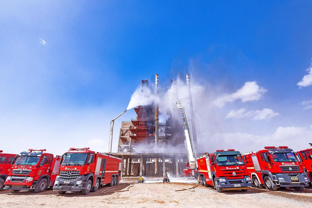 在“次生災(zāi)害滅火救援”科目現(xiàn)場,化工園區(qū)內(nèi)的熊熊烈焰映紅了半邊天。消防員身著隔熱服操控滅火機(jī)器人抵近火源,高噴車噴射出的泡沫如瀑布般覆蓋燃燒裝置,移動(dòng)炮陣列織就立體火網(wǎng)。從突破火線到追殲火頭,從清理余火到看守火場,救援人員輪替堅(jiān)守在一線,成功阻止火勢(shì)的蔓延。
