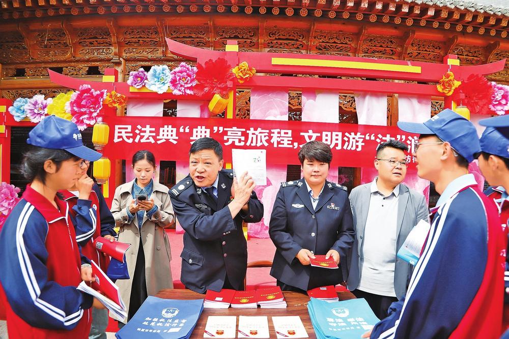 工作人員宣講民法典知識。5月11日,臨夏市司法局八坊司法所在蓋碗茶廣場開展民法典主題宣傳活動。新甘肅·甘肅法治報記者陳孝志攝
