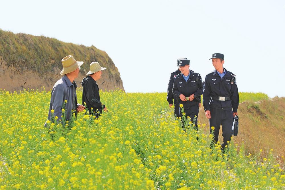 民警田間地頭走訪群眾。5月15日,定西市公安局安定分局組織民輔警開展社情民意大走訪,面對(duì)面傾聽群眾呼聲、征求群眾意見(jiàn),解決實(shí)際困難,宣講安全知識(shí),不斷增強(qiáng)人民群眾的獲得感、幸福感、安全感?! ⌒赂拭C·甘肅法治報(bào)通訊員楊永剛攝