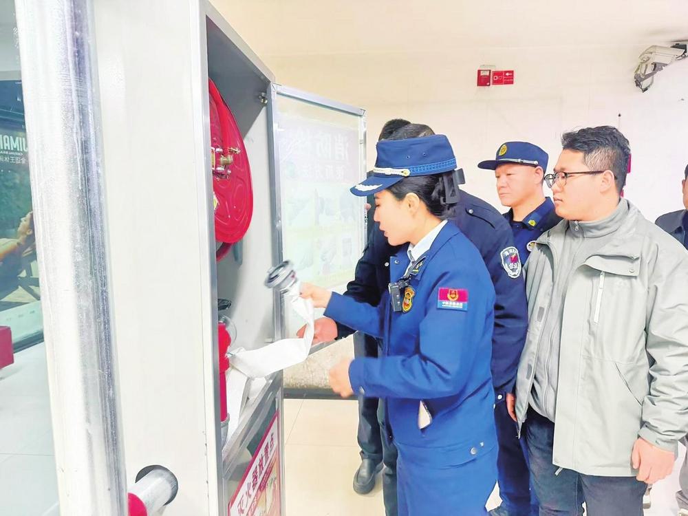 張文娟和同事檢查消防安全設施。城關(guān)區(qū)消防救援大隊供圖