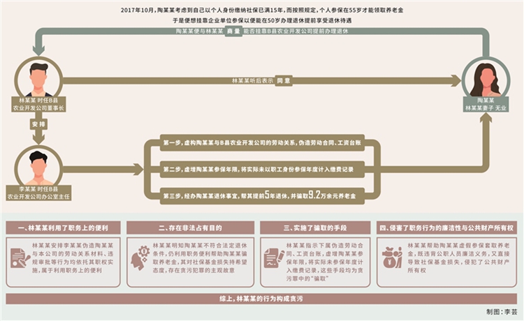 貪污罪。2017年10月,林某某妻子陶某某(無業(yè),另案處理)考慮到自己以個(gè)人身份繳納社保已滿15年,而按照規(guī)定,個(gè)人參保在55歲才能領(lǐng)取養(yǎng)老金,于是便想掛靠企業(yè)單位參保,以便能在50歲辦理退休、提前享受退休待遇?;诖耍漳衬潮闩c林某某商量能否掛靠B縣農(nóng)業(yè)開發(fā)公司提前辦理退休,林某某聽后表示同意,并利用擔(dān)任該公司董事長(zhǎng)的職務(wù)便利,在明知陶某某不符合提前退休條件的情況下,安排時(shí)任公司辦公室主任李某某(另案處理)虛構(gòu)勞動(dòng)關(guān)系,為陶某某以該公司職工身份辦理退休事宜。手續(xù)辦理過程中,李某某按林某某的安排,偽造B縣農(nóng)業(yè)開發(fā)公司與陶某某的《勞動(dòng)合同書》,經(jīng)林某某本人簽字后加蓋公司合同專用章,陶某某憑該合同在B縣人力資源和社會(huì)保障局進(jìn)行勞動(dòng)合同鑒證。完成鑒證后,陶某某順利以B縣農(nóng)業(yè)開發(fā)公司職工身份參保,當(dāng)年度公司為其繳納職工養(yǎng)老保險(xiǎn)、工傷保險(xiǎn)、失業(yè)保險(xiǎn)、醫(yī)療保險(xiǎn)共計(jì)7649.76元。其間,陶某某從未在B縣農(nóng)業(yè)開發(fā)公司上班,也未向公司補(bǔ)繳為其繳納的社保費(fèi)用。