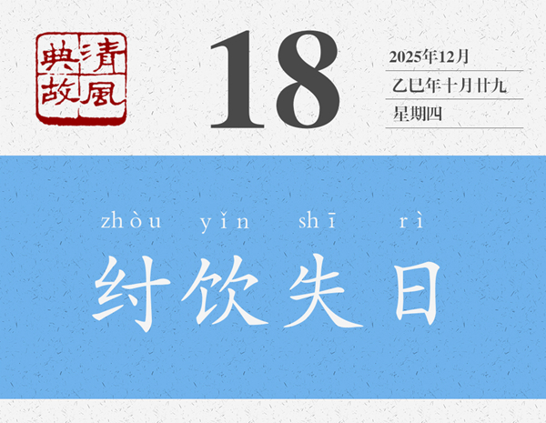 一提起商紂王,大概就會想起沉湎酒色、窮兵黷武、重刑厚斂等等,與之相關的典故也有酒池肉林、炮烙之刑、牝雞司晨等等。“歡以失日”是他沉湎酒色的又一個故事,往輕處說就是酒醉失憶了,往重處說就是把一切都拋到九霄云外了?;?,即子胥余,商紂王的叔父,官至太師,封于箕,故稱箕子,“殷末三仁”之一,《論語·微子》曰:“微子去之,箕子為之奴,比干諫而死,殷有三仁焉。”箕子曾多次勸諫紂王,但紂王不聽,他心灰意冷,索性披發(fā)佯狂,紂王見此,以為箕子真瘋了,遂將他囚禁起來,貶為奴隸。有了這個背景,就知道箕子為什么要“辭以醉而不知”了。后世則以“紂飲失日”為典,形容生活荒唐混亂,也用來形容不辨時間。黃遵憲詩《倫敦大霧行》:“蒼天已死黃天立,倒海翻云百神集。一時天醉帝夢酣,舉國沉迷同失日。”
