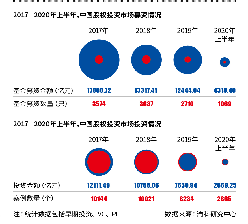 2020年上半年市場共有1069只基金完成新一輪募集,金額總計4318.40億元人民幣,同比下降29.5%;市場共發(fā)生2865起投資事件,涉及金額2669.25億元,同比分別下滑32.7%、21.5%。