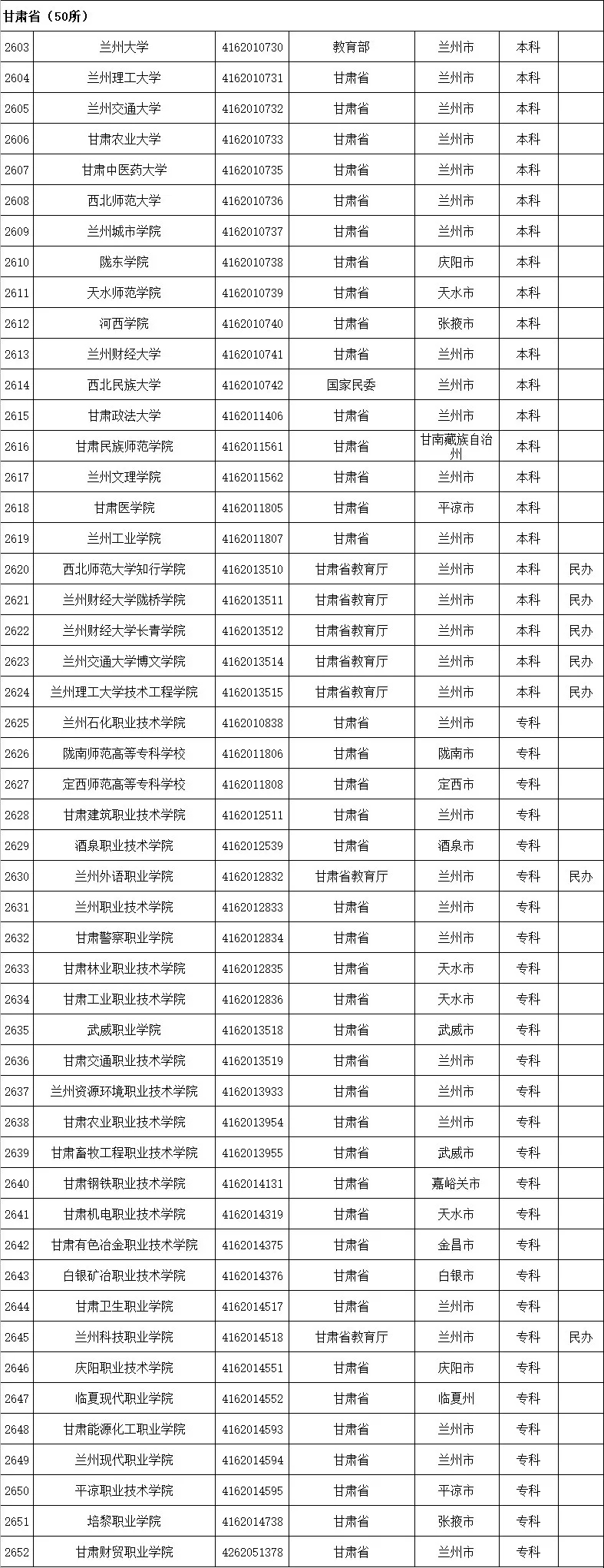 3   甘肅省有普通高校50所成人高校5所