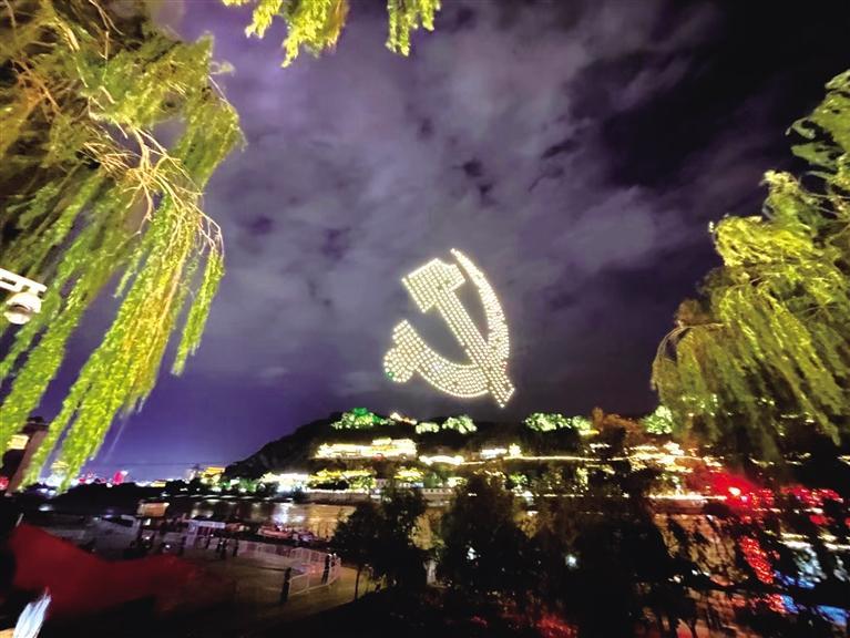 今夜的蘭州經(jīng)過雨水的沖洗格外清爽嫵媚,在現(xiàn)場(chǎng),600架無(wú)人機(jī)翱翔天空,照亮璀璨的蘭州之夜,無(wú)人機(jī)在遙控下變換著各種隊(duì)形和字樣,表達(dá)對(duì)黨的生日祝福。