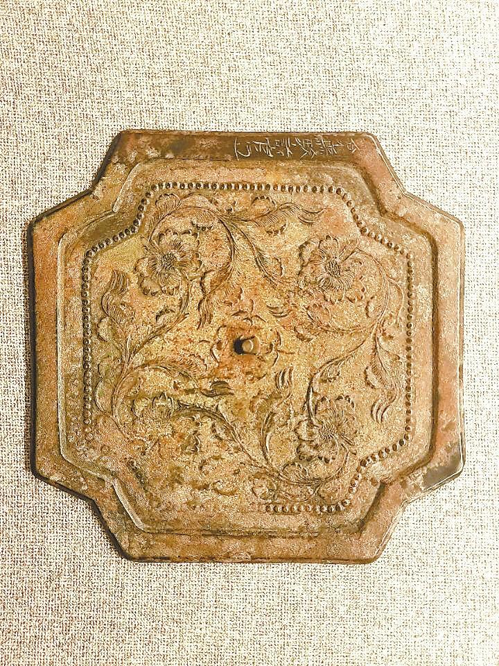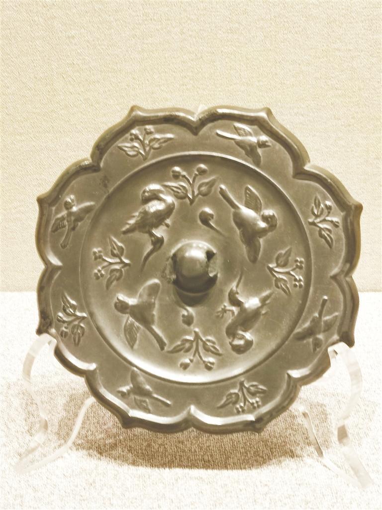 平?jīng)鍪胁┪镳^藏,唐代,八瓣菱花形,內(nèi)切圓形,圓鈕。上下左右交隔對稱分布四只鸞鳥、四枝二葉二苞折枝花。