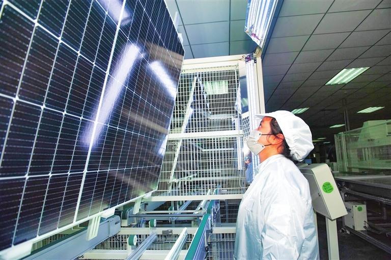 酒泉正泰新能源科技有限公司職工正在車(chē)間內(nèi)檢查組裝好的光伏發(fā)電板。