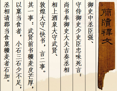 此簡為漢宣帝回復(fù)酒泉太守“辛武賢”和敦煌太守“快”奏疏的恩準(zhǔn)詔書,簡文記載的是皇帝詔書中對兩太守奏疏內(nèi)容的復(fù)述。從簡文內(nèi)容看,酒泉太守辛武賢和敦煌太守快給朝廷的奏疏主要涉及兩件事情:一是辛武賢認(rèn)為作為糧草的穬麥因皮厚芒長,如按規(guī)定每人發(fā)放小石三石,會造成實(shí)際數(shù)量的不足,所以他請求皇帝每石加發(fā)若干。另一件事顯然是敦煌太守快的上書,但文字未能容納于此簡,故不得而知。