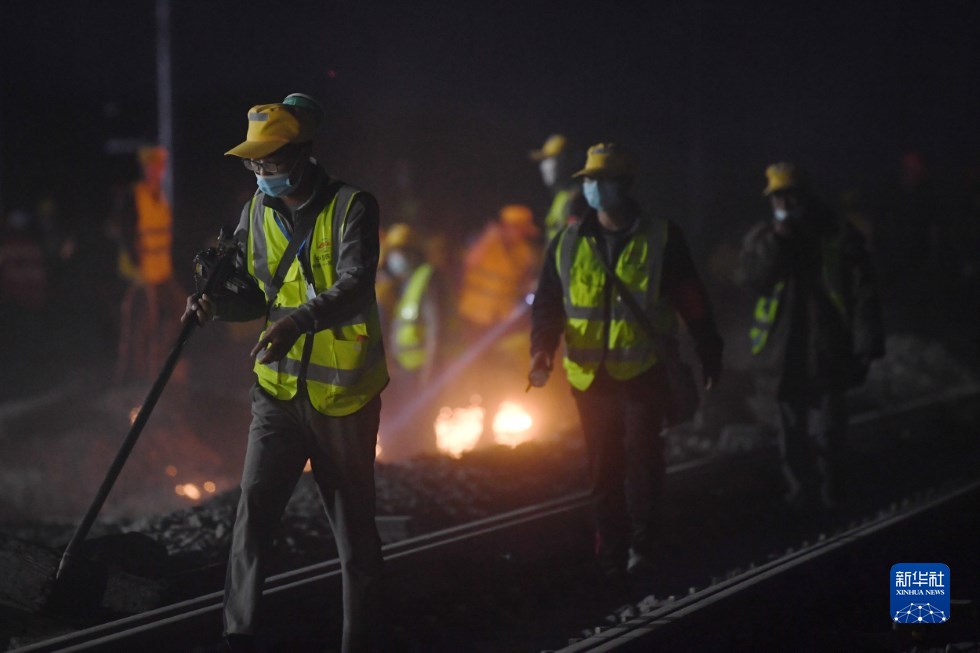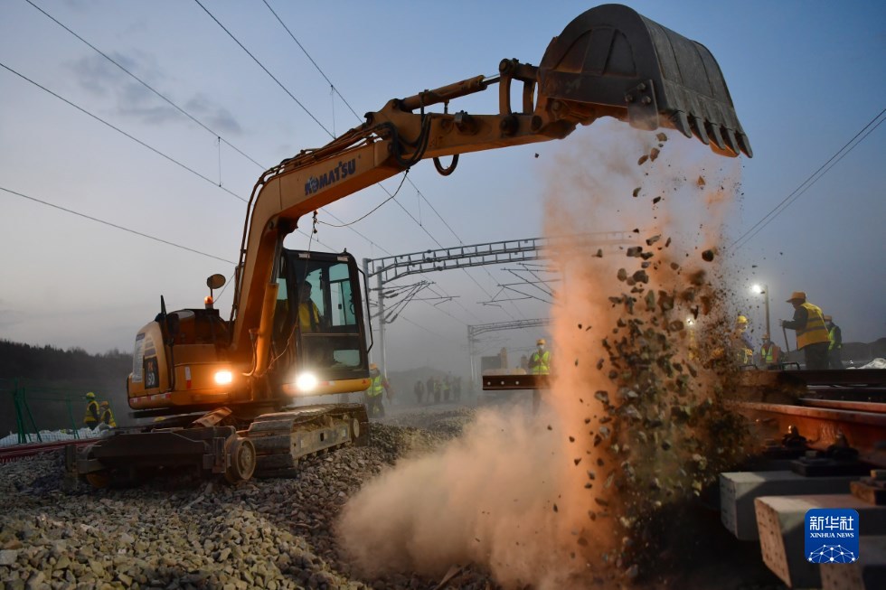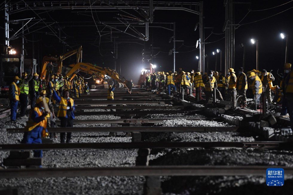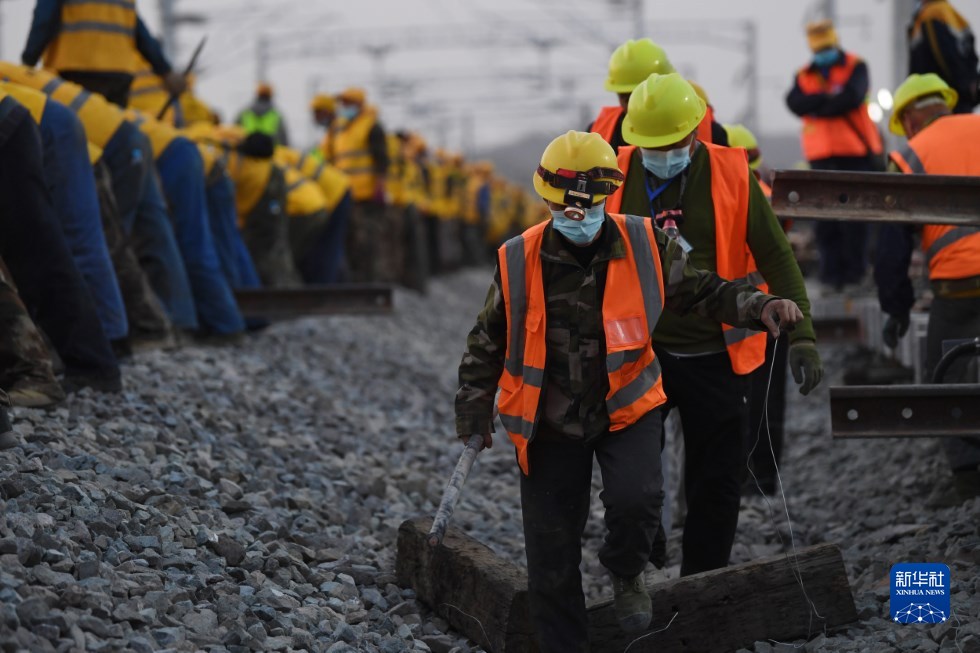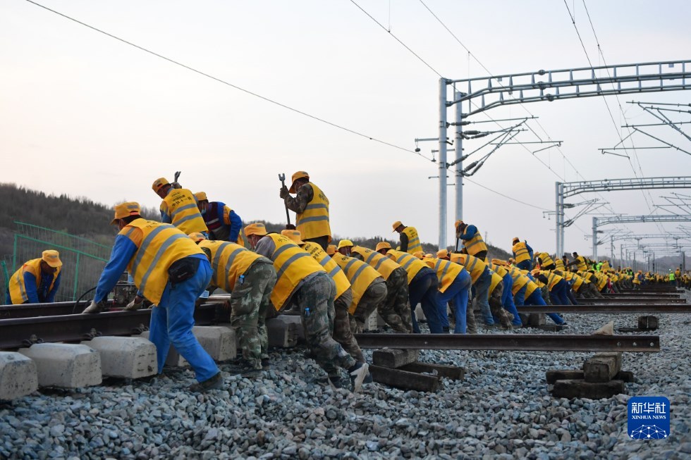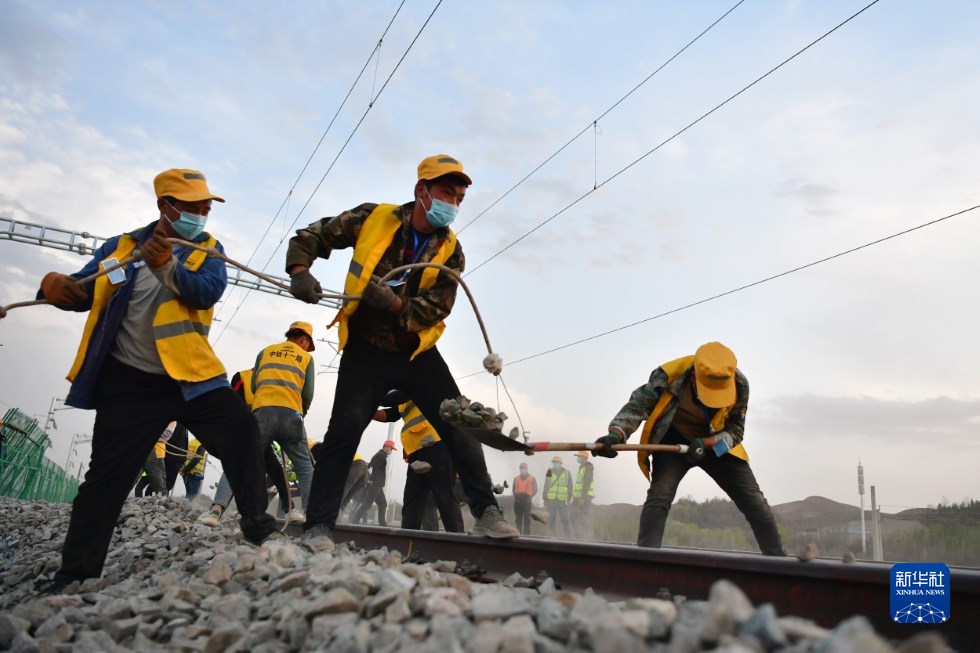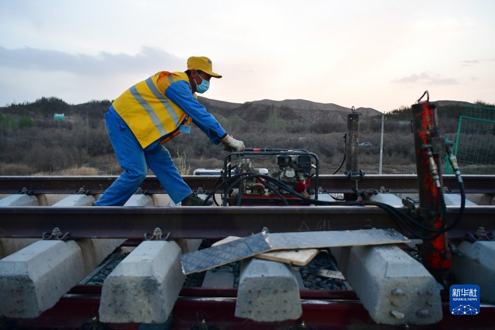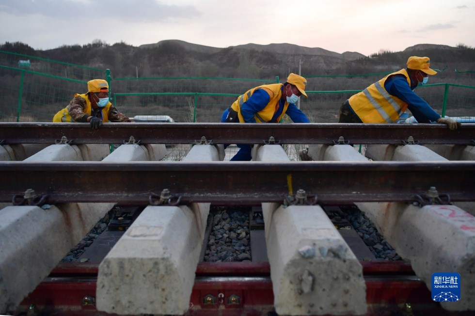 中鐵十一局建設(shè)者在中蘭客專(zhuān)(甘肅段)接入中川城際鐵路道岔插鋪施工現(xiàn)場(chǎng)作業(yè)(4月26日攝)。新華社記者 陳斌 攝
