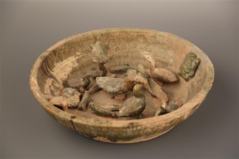 綠釉陶陂池高15厘米,口32厘米,底16厘米,為蘭州市博物館館藏三級文物。陶陂池內(nèi)有形象生動的鴨、鵝、龜、青蛙等造型,代表墓主人生前擁有這樣一份家產(chǎn)。陂池,指在自然坡地筑堤蓄水澆灌農(nóng)田的池塘、澤沼。我國興修陂池的歷史很早,傳說夏禹治水時,曾從事“陂九澤”的工程。利用地勢蓄水灌溉,在古代較為普遍,尤其在漢代時陂池工程得到較大發(fā)展。陂池養(yǎng)魚、家禽、種藕、種菱角、養(yǎng)龜,不僅可提高農(nóng)民的經(jīng)濟收入,豐富人們的食物來源,還可以起到美化環(huán)境、凈化水質的作用,青蛙、田螺自由生存,起到平衡自然生態(tài)的作用。