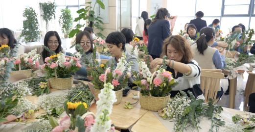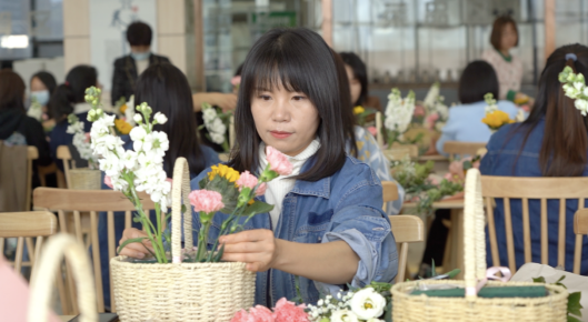 繁花似錦報(bào)春來(lái),天姿國(guó)色抒情懷?;顒?dòng)現(xiàn)場(chǎng)花香四溢、芬芳溫馨,充滿著春天般的氣息,大家手捧鮮花,在花藝?yán)蠋煹闹v解下,開(kāi)始學(xué)習(xí)各種鮮花所蘊(yùn)含的花語(yǔ)祝福和選花、裁剪、搭配、造型及養(yǎng)護(hù)等藝術(shù)插花技巧。隨后,女工們將原本普普通通的月季、康乃馨、蝴蝶蘭、滿天星、向日葵等多種花材修剪整枝,根據(jù)不同的色彩和形狀有層次地搭配在一起。通過(guò)精心構(gòu)思造型、發(fā)揮創(chuàng)意想象,有的注重意境創(chuàng)設(shè)追求,有的突出枝情花韻之趣,有的抒展自然樸實(shí)風(fēng)格……在細(xì)致地修飾和精心地創(chuàng)作下,一枝花、一棵草都變得詩(shī)情畫意和清新怡人,節(jié)日的喜慶氣氛瞬間升騰。