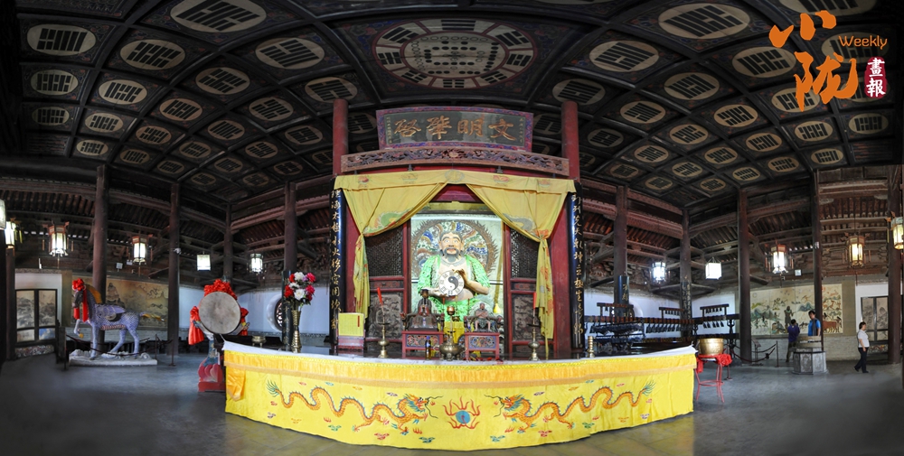先天殿莊嚴(yán)肅穆,殿內(nèi)正中便是高達(dá)3米的人文始祖伏羲坐身塑像,樹(shù)葉披身,手持八卦盤,氣宇軒昂,雙目炯炯凝視前方,神龕上方懸掛著清嘉慶時(shí)州牧王賜均書“文明肇啟”巨匾,仰頭上望,頂上繪有河圖洛書、六十四卦,令人肅然起敬。