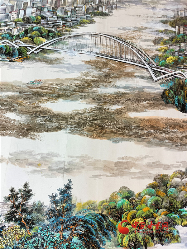 李建春,黃河上的橋梁也是他構(gòu)思畫面的重要部分,從小西湖出發(fā),有小西湖黃河大橋,中山橋,元通大橋,城關(guān)黃河大橋,金雁黃河大橋等各有特色的橋梁,但是畫的多了畫面被割裂,畫的少了有顯示不出來黃河的人文景觀,最后他畫了中山橋和金雁黃河大橋,就像畫框一樣圈住了城市的風(fēng)景。