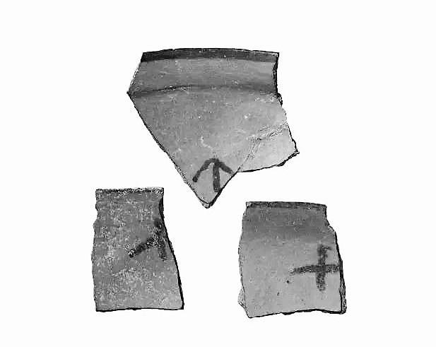 遺址中出土的帶有彩繪符號的陶片。