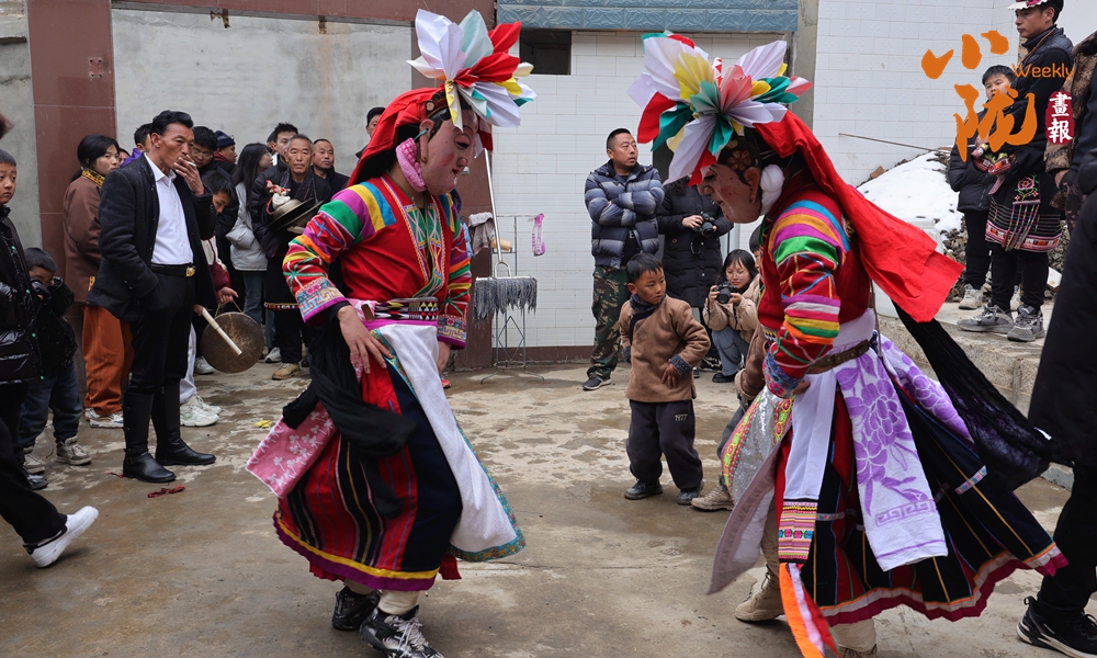 河畔的小路上和河岸的觀景臺上,白馬人身著特色服飾,錯落有致,載歌載舞,跳起了獨具魅力的“池哥晝”。