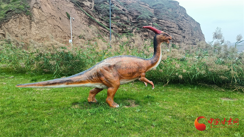 附近的山腳、水岸、草地上,不時(shí)有栩栩如生的恐龍雕塑或駐足遠(yuǎn)眺或奔跑雀躍,仿佛穿越了時(shí)空,回到了史前世界。