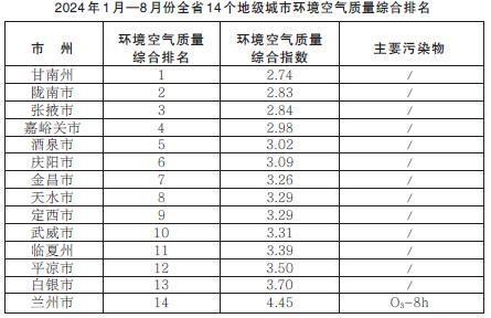 甘肅省生態(tài)環(huán)境廳發(fā)布2024年1月—8月份全省14個地級城市環(huán)境空氣質量排名情況
