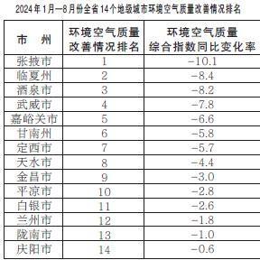 2024年1月—8月份,全省14個地級城市環(huán)境空氣質量改善情況排名由好到差分別為:張掖市、臨夏州、酒泉市、武威市、嘉峪關市、甘南州、定西市、天水市、金昌市、平?jīng)鍪?、白銀市、蘭州市、隴南市、慶陽市。