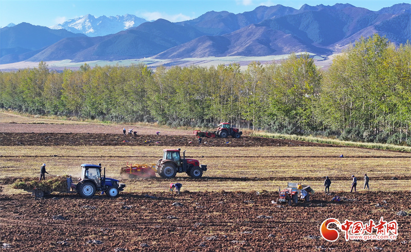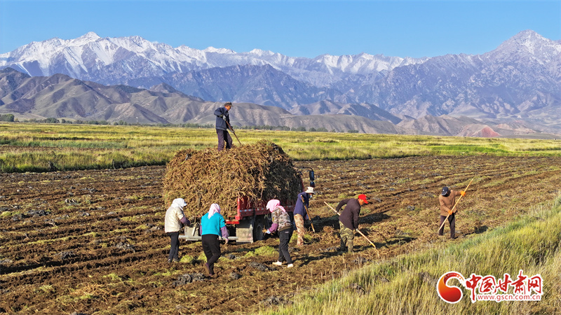 10月7日,位于祁連山腳下的張掖市民樂縣南豐鎮(zhèn)張連莊村的千畝黃芪種植基地,藥農們忙著采收黃芪,田間地頭一派豐收的繁忙景象。