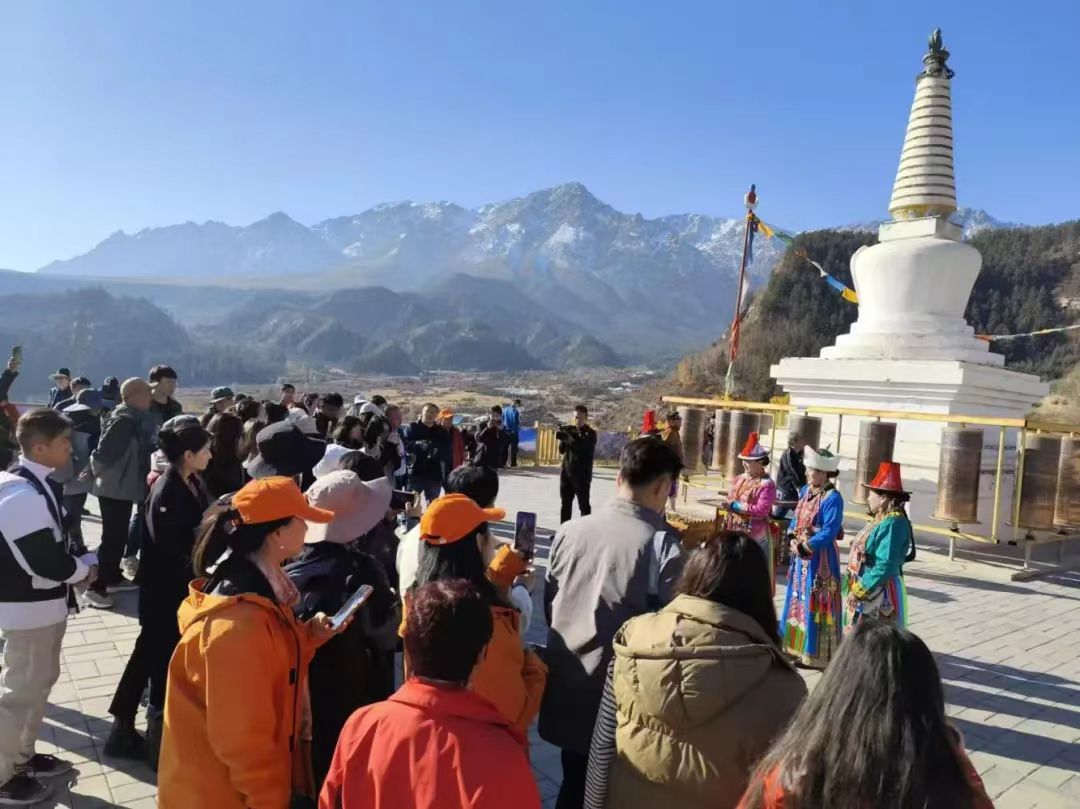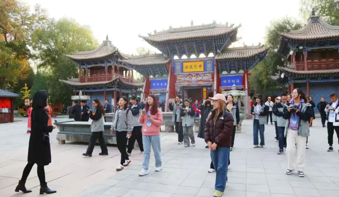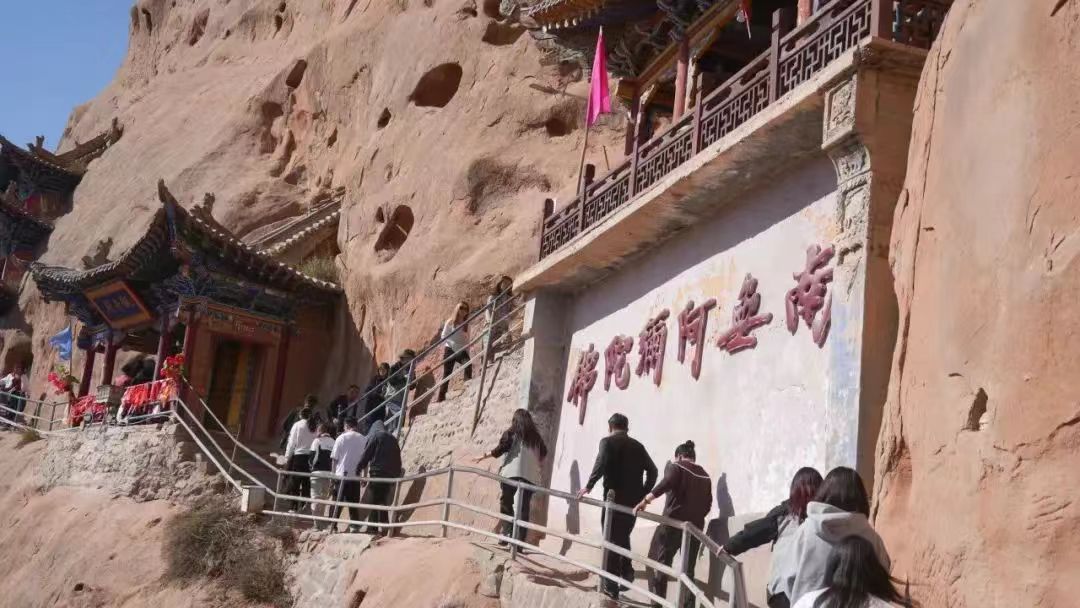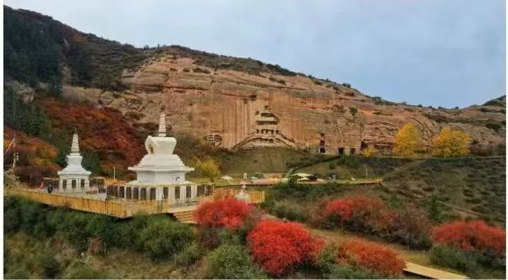 18日上午,迎著耀眼的晨光,采訪團成員乘坐大巴車來到了集自然風光、石窟藝術、民族風情、宗教文化于一體的肅南馬蹄寺。馬蹄寺是河西走廊著名的佛教勝地,石窟群開鑿于十六國北涼時期,距今約1600年的歷史,是絲綢之路上至關重要的歷史文化瑰寶,也是我國早期石窟的杰出代表。秋日的馬蹄寺,秋高氣爽,景色宜人,遠遠看去,紅綠相間,層林盡染,大家行走在落葉飄零的山間小路上,對這座建在懸崖峭壁之上、將棧道鑲嵌在山體之內(nèi)的石窟充滿了好奇。