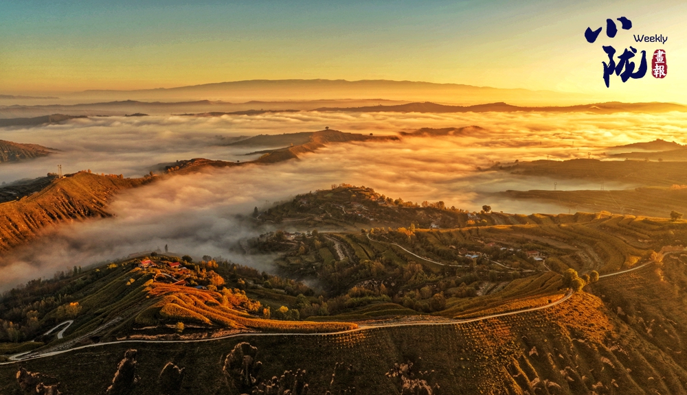仿佛一夜之間,大北山被染成了暖黃色。極目遠(yuǎn)眺,云海漫過蒼翠的山脊,與天邊燃燒的晚霞交融成流動(dòng)的錦緞,夢(mèng)幻般的色彩恣意鋪張,金色與藍(lán)天、山坳交織在一起,格外溫馨浪漫。