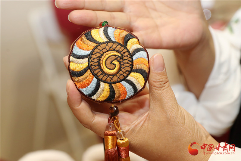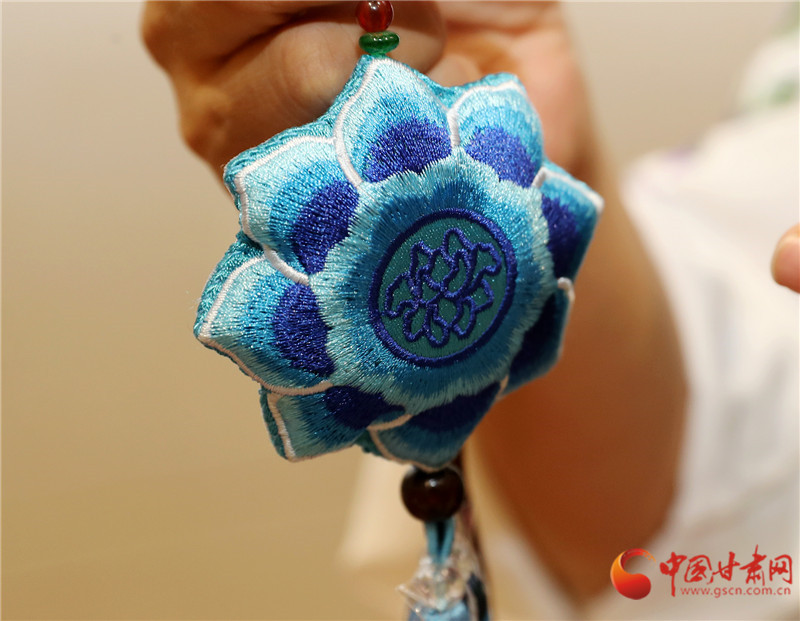 甘肅省博物館非遺集市的展臺前,包雨蕾的敦煌藻井香包一亮相就攥住了人的目光——青綠色絲線繞出的蓮瓣層層疊疊,中心飛天剪影隨腳步輕晃,清雅檀香混著花草香漫開來。這款光是飛天飄帶針法就琢磨了一個(gè)月的新作,藏著她的心思:用慶陽香包的針腳,把甘肅的千年文脈繡進(jìn)當(dāng)下生活。