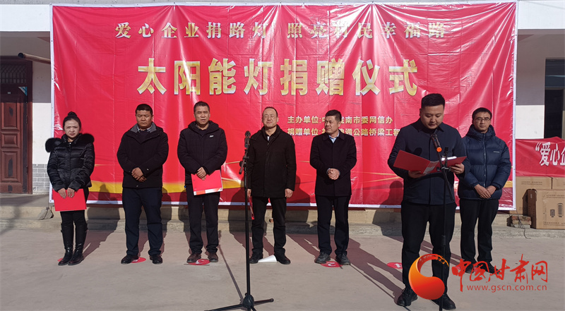當(dāng)日,隴南市委網(wǎng)信辦還聯(lián)合禮縣工商聯(lián)、禮縣鼎通公路橋梁工程有限公司舉辦了“愛心企業(yè)捐路燈 照亮村民幸福路”捐贈儀式,為李壩村捐贈價值5萬元的260盞太陽能路燈,助力美麗鄉(xiāng)村建設(shè),照亮村莊夜晚。
