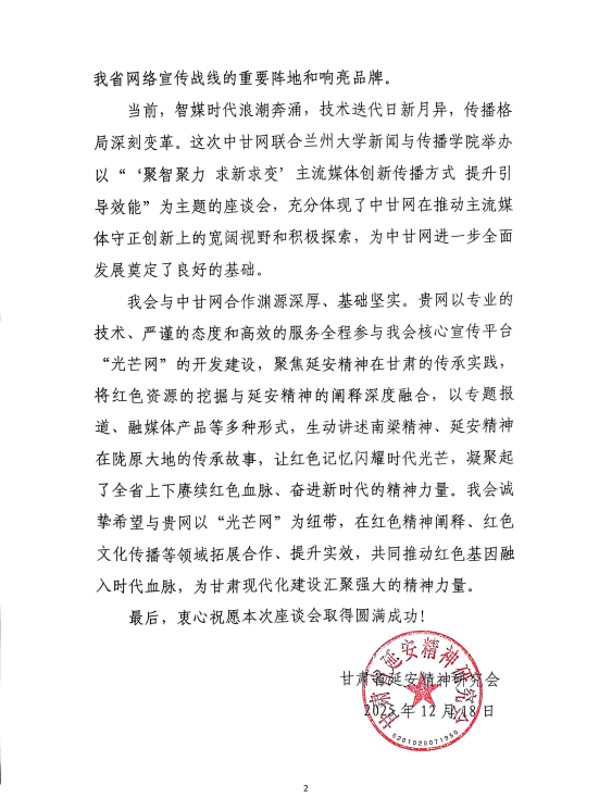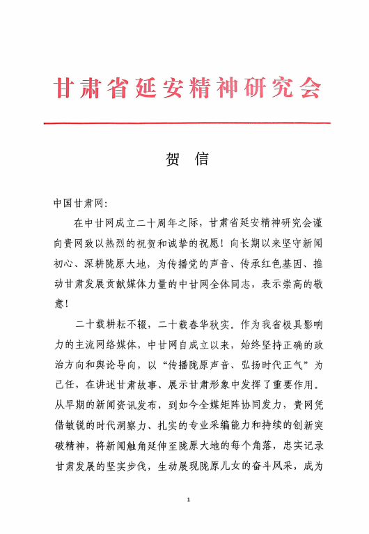 中國(guó)甘肅網(wǎng)12月22日訊(西北角·中國(guó)甘肅網(wǎng)記者 劉姍)值中國(guó)甘肅網(wǎng)成立二十周年之際,甘肅省延安精神研究會(huì)向中國(guó)甘肅網(wǎng)發(fā)來賀函,致以熱烈祝賀與誠(chéng)摯祝愿。