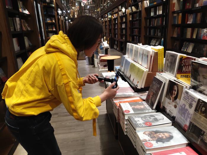 此前,鐘書(shū)閣靜安店店長(zhǎng)原揚(yáng)在直播“探店”。受訪者供圖