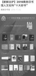 “商務(wù)印書館人文社科好書評選”被中央電視臺等媒體稱為“年度圖書榜單風(fēng)向標(biāo)”。每每公布后,央媒及主流媒體都會予以報道,同時在新媒體平臺也會進行系列宣傳,比如2019年的好書評選人民日報官方微信發(fā)布后一天內(nèi)的閱讀量便超過了888萬。