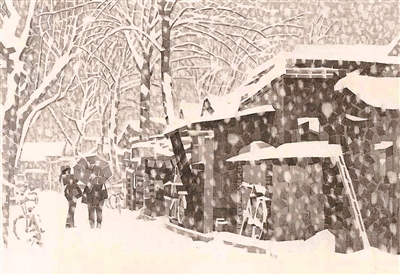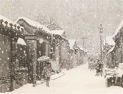 休息日,大雪天,況晗背著畫具出門作畫。濕式水彩畫,講究水色淋漓,是用排筆將清水洇濕畫紙然后作畫。一幅寫生未成,畫筆已然結冰。況晗的家鄉(xiāng)氣候濕潤,墻縫里面生的是青苔。北京的氣候干燥,墻縫里面積存的是數(shù)百年的塵土。家鄉(xiāng)村野的色調是青綠,京城胡同的色調是灰白,于是況晗改用寬線條鉛筆畫來寫意胡同。