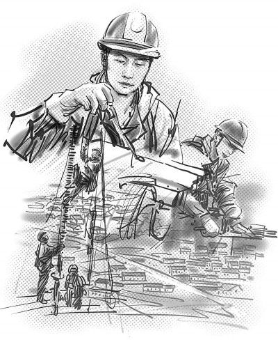 就個人條件而言,胡洪煒一米八的身高其實并不適合帶電作業(yè),但三年軍營練就的結實精壯以及先天的敏捷機靈完美地補充了身高的短板。多年之后,閆旭東依然清晰地記得徒弟曾經帶給他的震撼。帶電作業(yè)兩大危險,一是高空,一是帶電。軟梯是電力人得以騫翮遠翥的依傍,可攀爬軟梯卻一度打濕了胡洪煒振翅欲飛的翅膀。新員工入職培訓的訓練場上,別人用一個月已經熟練掌握了技巧,笨鳥胡洪煒卻剛剛及格。氣喘吁吁地爬到基塔的頂端,將自己蟄伏在離地面幾十米高的電線上,想像自己是一只俯瞰大地的鳥雀,一只暫時休整的雨燕,抑或是被印刷在音樂課本上的音符。音符在胡洪煒耳邊輕聲吟唱:我要飛得更高,更高!