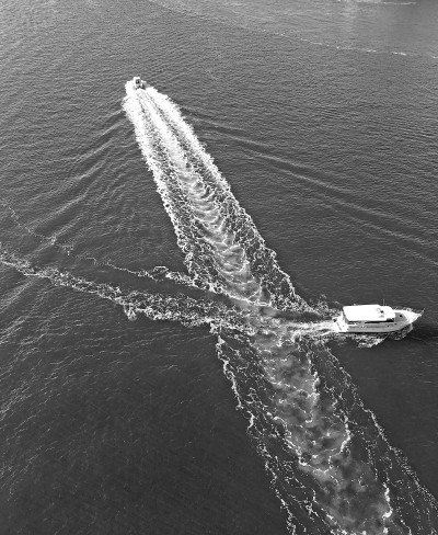在這張照片里你看見了,天氣晴朗,海水蔚藍,兩船交叉駛過,畫出如此美麗的浪花。這兩艘游船并不是匆匆過客,而是相約作一次表演,海域內(nèi)洋溢著歡樂的氣氛。