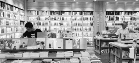 9:00,書店開始營業(yè)。走進(jìn)書店,看到店內(nèi)裝修色調(diào)溫和,視野開闊,藏書豐富。臨門迎接讀者的是位于正中央的圓形桌臺(tái),上陳列各類精品圖書,擺放造型精美,儀式感十足。沿著桌臺(tái)外圍是一圈白色座位,可供讀者坐下閱讀。