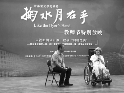 九月十日教師節(jié),南開(kāi)大學(xué)舉辦《掬水月在手》影片首映式。葉嘉瑩先生是國(guó)際儒聯(lián)榮譽(yù)顧問(wèn),我銜命陪同王念寧副會(huì)長(zhǎng)專程赴南開(kāi)致賀,有幸在南開(kāi)禮堂聆聽(tīng)九十六歲高齡的迦陵先生與白巖松共話詩(shī)意人生。迦陵先生坐在輪椅上娓娓道來(lái),鬢發(fā)皤然,聲如洪鐘,風(fēng)華絕代。