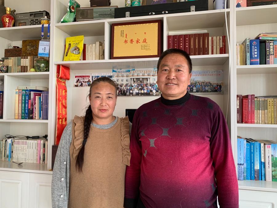 2020年12月10日,牧民敖特根達來和妻子在自家“書香家庭”獎牌前合影。新華社記者 朱文哲 攝