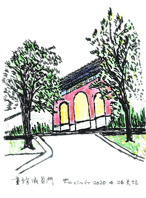 書已寫罷,小寒節(jié)氣過后,我又多次去天壇,不為寫作,只是習(xí)慣,仿佛腳步慣性,去天壇轉(zhuǎn)轉(zhuǎn),就會(huì)感覺充實(shí)一些。2020年1月20日正值大寒節(jié)氣,那天下午,我從圜丘到成貞門西北側(cè),那里并排有兩把座椅,我坐在座椅上畫成貞門。春節(jié)將近,除了工人在懸掛紅燈籠、安裝慶祝春節(jié)的展牌,天壇里的游人并不多。我和很多游人一樣,不知道,或者說不敏感,一場(chǎng)疫情正如餓虎撲食那樣向我們迫近。