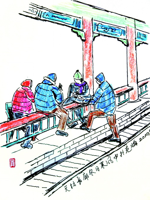 童年時(shí),我家離天壇很近,即便是現(xiàn)在的住所,離天壇也不算遠(yuǎn),地利之便,使我和天壇有種天生的緣分。這種緣分不是一見鐘情,而像長(zhǎng)時(shí)間接觸磨出來的老繭,結(jié)實(shí)且持久。幾十年來,天壇是我最常去的公園,最近幾年迷上畫畫,更要去那里畫速寫。由于畫畫,身邊總會(huì)站著幾個(gè)看畫的人,無(wú)論褒貶,一定得聊上幾句。以前有人看我畫畫,我老覺得不自在,后來臉皮不僅變厚了,心里還冒出個(gè)念頭:如果天天到這里畫畫,可以接觸到好多人,隨手記下各色人等的人生百態(tài),這不是挺有意思的嗎?