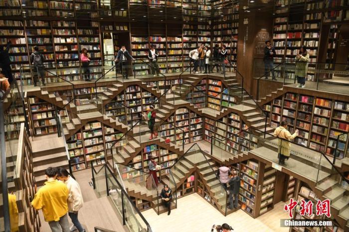 資料圖:重慶九龍坡區(qū)商圈內(nèi),一書店因設計感非常獨特,吸引了不少民眾前來打卡玩耍。陳超 攝